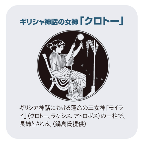 ギリシャ神話において「クロトー」は人の運命を司る三女神の一つであり、生命の誕生に立ち会い、生命の糸を紡む女神と伝えられます。遺伝子にKlothoの名をつけた鍋島氏は、生命の機能を維持するために欠かせないこの遺伝子に、女神の姿を重ねてきたようです。