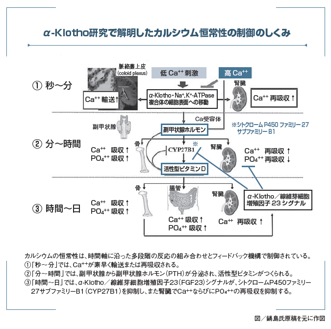 鍋島 そうです。わかったことは、細胞外カルシウム濃度が下がるとKlothoとNa+,K+-ATPaseの複合体が細胞表面に移動し、Na+の濃度勾配の変化により腎臓や脳の脈絡叢でのカルシウムの再吸収や輸送が起こり、副甲状腺ホルモンの分泌が誘導され、さらにビタミンD合成が制御され、カルシウム濃度が上昇します。そしてカルシウム濃度が上がるとこの応答は止まります。生命は細胞外・血中カルシウム濃度を常に一定に保たなければなりません。重要なことに、「秒~分」の早さでα-Klotho・Na+,K+-ATPase複合体が細胞膜に移動し、「分~時間」の早さで副甲状腺ホルモンが分泌され、「時間~日」のスパンでビタミンDが作動します。これらの三つの経路が相互に反応し制御し合うことにより絶えずカルシウム濃度が一