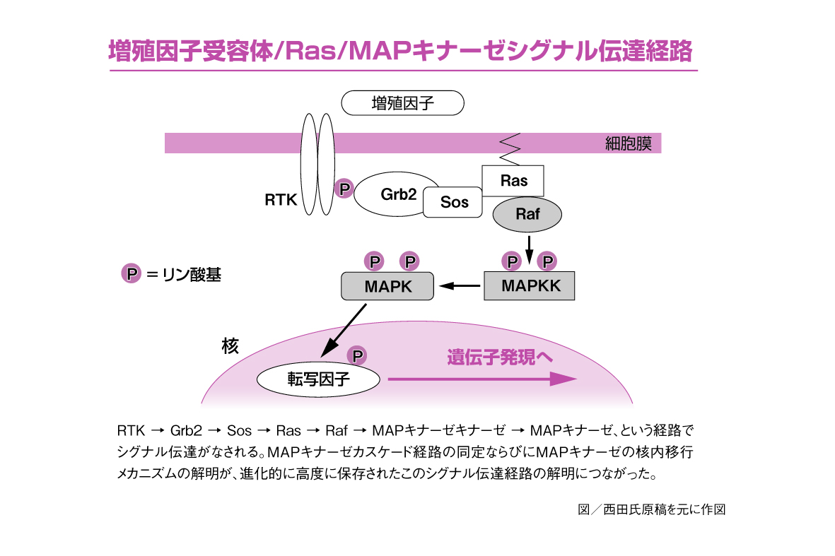 このように西田氏は、上流のキナーゼ(RAFキナーゼ)が下流のキナーゼ(MAPキナーゼキナーゼ)を活性化し、それがさらに下流のキナーゼ(MAPキナーゼ)を活性化するといった連鎖反応の存在を明らかにしたのです。