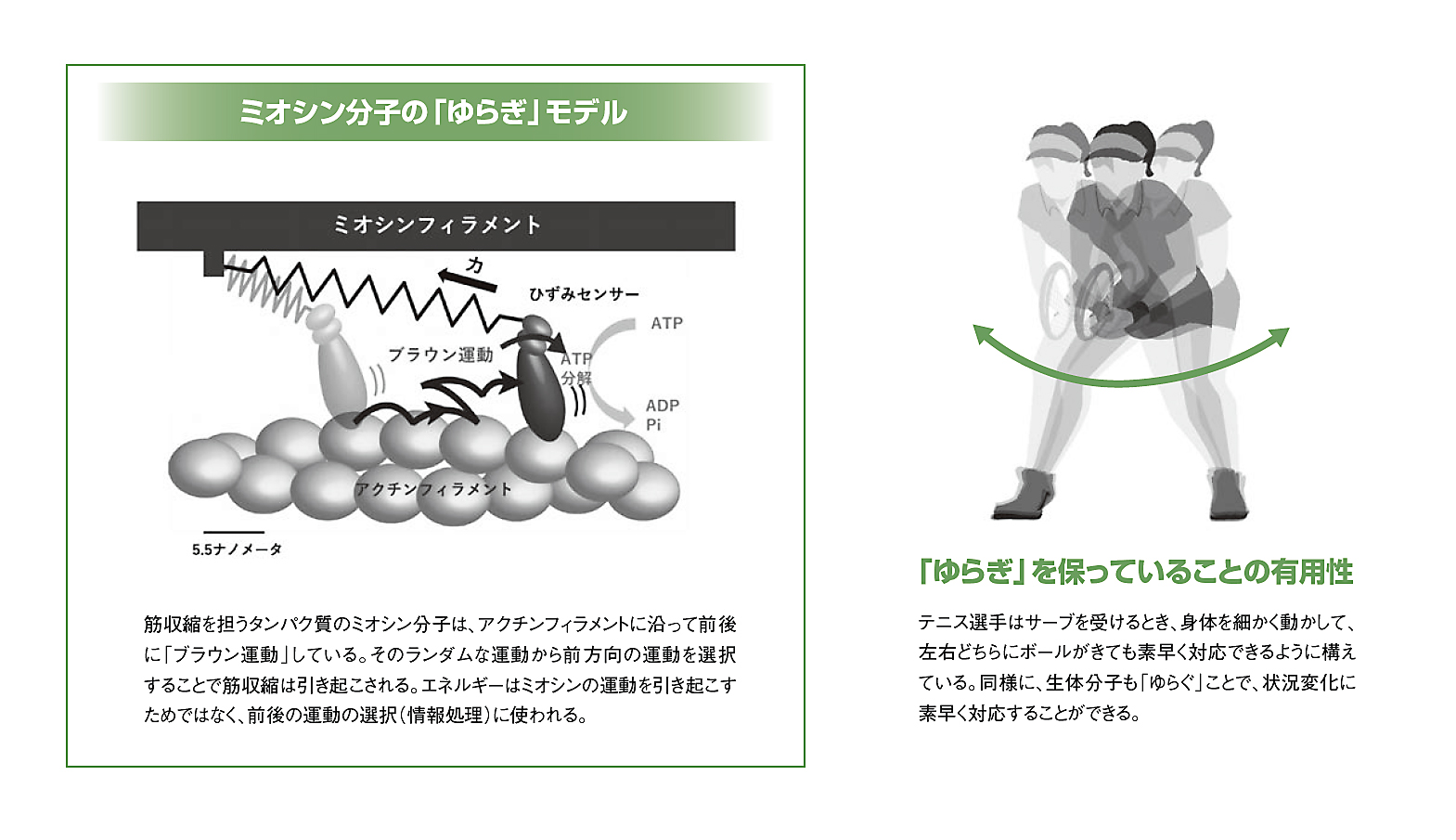 柳田 そうです。ミオシン分子のブラウン運動は前後にでたらめにゆらいでいます。そのままでは方向性のある運動は生まれません。エネルギーは、ミオシン分子がブラウン運動の方向を判断し前方向の運動を選択するために使われるのです。前後の判断はミオシン分子が持っているひずみセンサーで行われています。