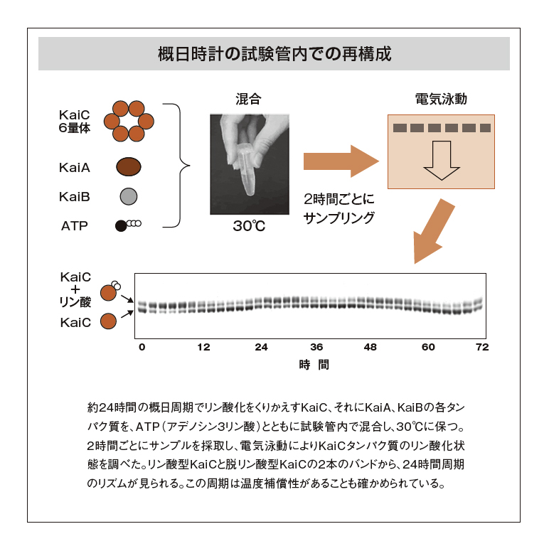 近藤 はい。研究が大きく動いたのは2004年、私の研究室の大学院生だった冨田淳さん(現・名古屋市立大講師)と助手の岩崎秀雄さん(現・早稲田大学教授)による偶然の発見でした。彼らは、シアノバクテリアのリズム同調について研究していました。シアノバクテリアのリズムは、24時間のうち12時間を暗くすると同調できます。それで彼は、暗い時間帯にシアノバクテリアのKaiタンパク質や遺伝子発現がどうなっているかを調べていました。シアノバクテリアは光独立栄養生物でして、光がないとエネルギーを取り込めませんので遺伝子発現が起きません。では、Kaiタンパク質の状態はどうなっているかと測ったわけです。すると、連続暗条件でもKaiCのリン酸化のリズムは保たれていたのです。暗いのでKaiCの遺伝子発現が完全に抑えられているにもかかわらず。