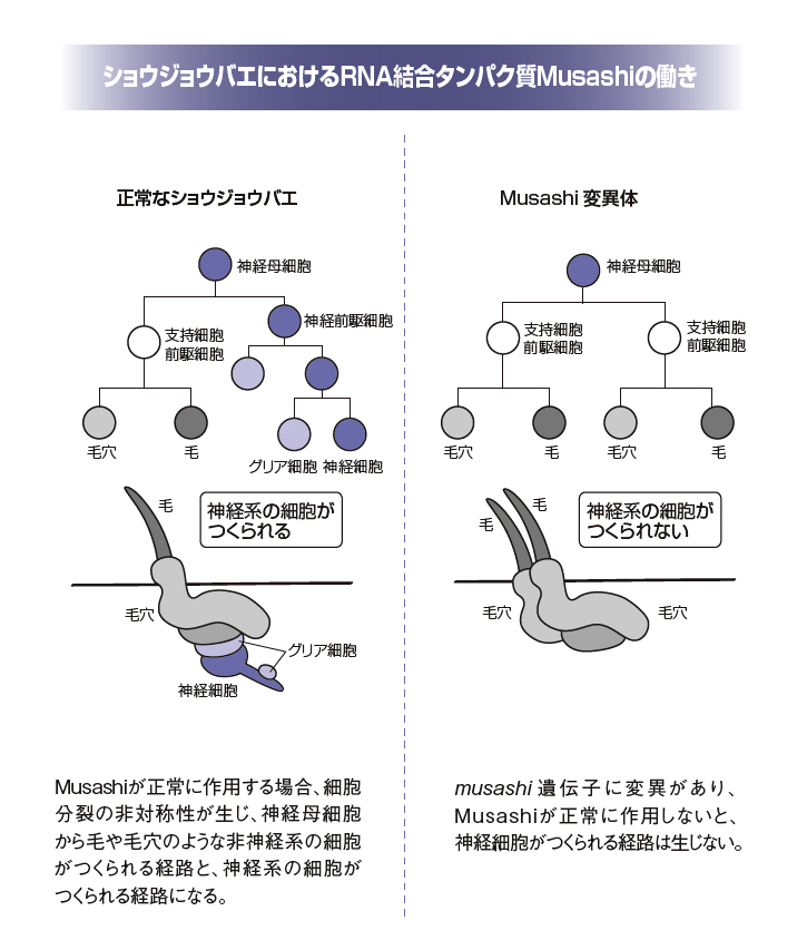 結局これは、musashi遺伝子にコードされたRNA結合タンパク質が、翻訳調節を介することで、非対称性分裂を制御しているということになります。この結果を『ネイチャー』で発表したところ、興味深く思ってもらえて、いろんな教科書に載るようになりました。