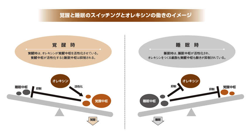 柳沢 そのスイッチがどう入っているのかは、いまだに明確には解明されていないんです。でも解釈は可能です。脳のなかに、覚醒と睡眠を切り替えるスイッチ役の神経細胞群が何ヶ所かにあり、それらが抑制しあうように神経回路を形成していて、シーソーのように睡眠か覚醒かのどちらかに傾くようになっているということだと思います。そのなかで、オレキシンは覚醒側に傾かせる機能をもちますが、それだけでなく、より大切なことに、シーソーの動きを安定化させる機能ももっているのだと解釈しています。