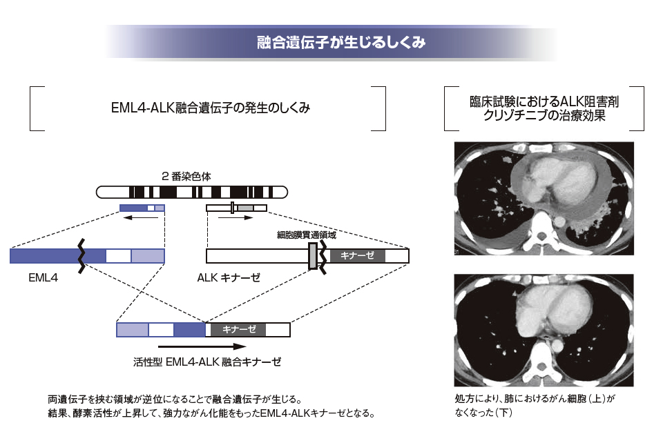 間野 ええ。ALKはEML4と融合すると肺がんをつくるのですが、ALKがNPMという遺伝子と融合すると悪性リンパ腫をつくるし、VCLという遺伝子と融合すると腎髄質がんをつくるといったことがわかっています。がんについては遺伝子を調べないと最適な治療法を選べないというふうになってきているので、やはりEML4-ALK融合遺伝子の発見は、がんのゲノム医療が進むきっかけになったとは思うんですよね。