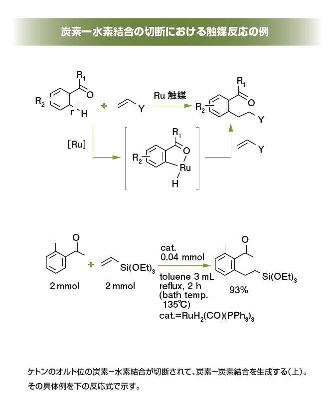 岸本 ルテニウム。これで炭素と水素の結合を切れば、切れたところになにかをつないで、ちがうものをつくることができるようになるわけですか。